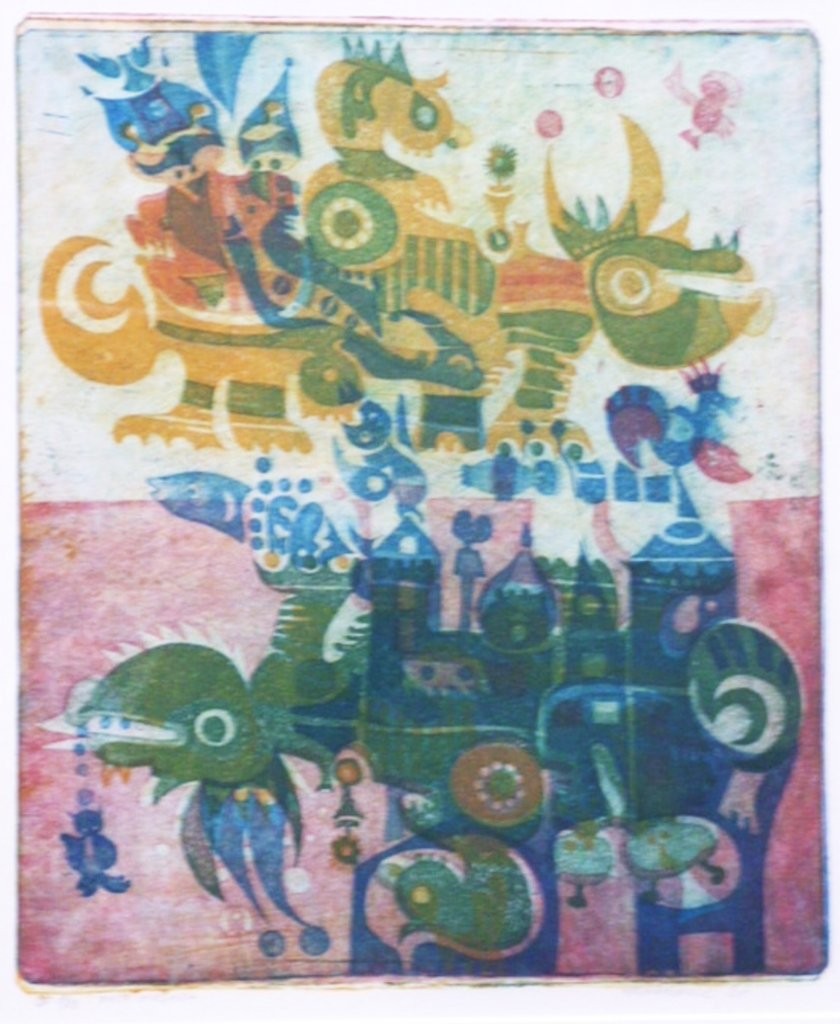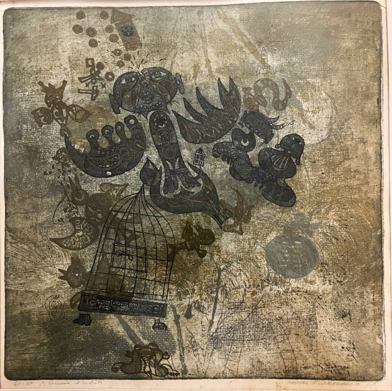 Michel stuurde deze ets als nieuwjaarswens rond met de tekst: ‘christhilde michel en manuel wensen u vrede toe in deze tijd van licht’. Voor zover ik weet, is dit de enige ets als nieuwjaarswens die Michel ooit gemaakt en verstuurd heeft. Hij is ook niet gesigneerd, maar rechtsonder in de ets staat zijn naam.
