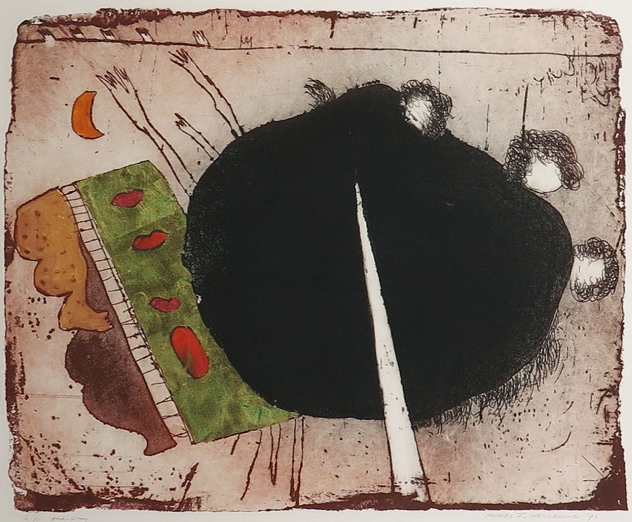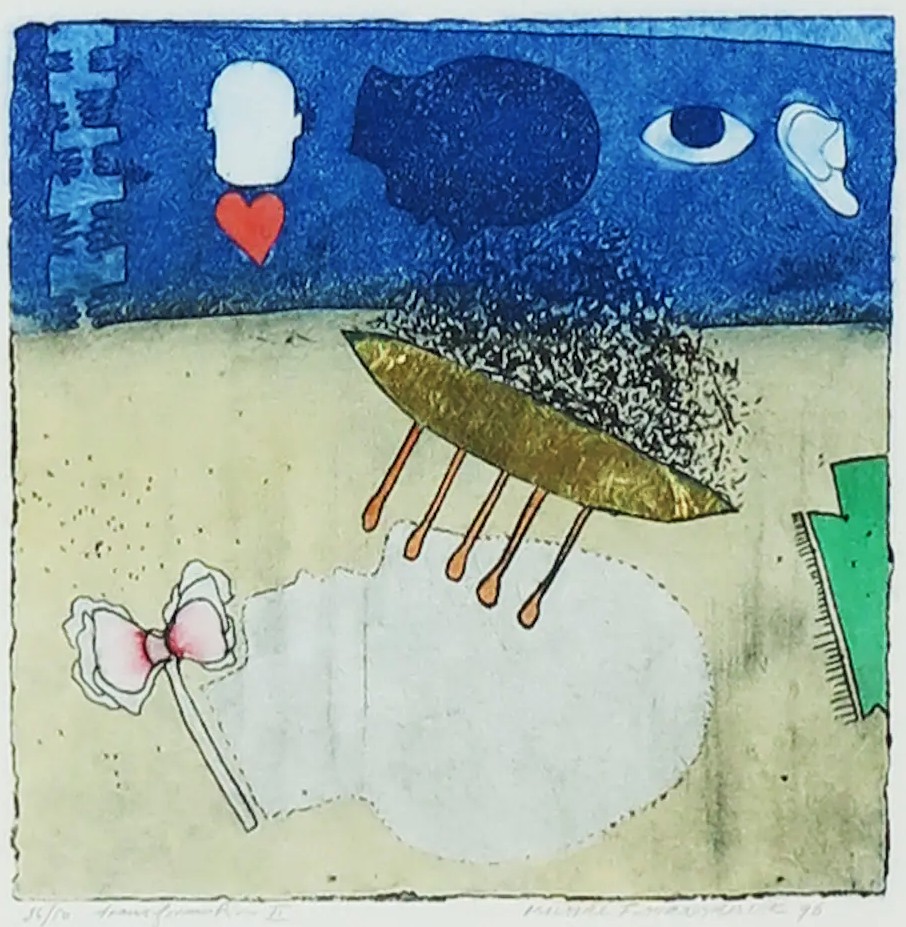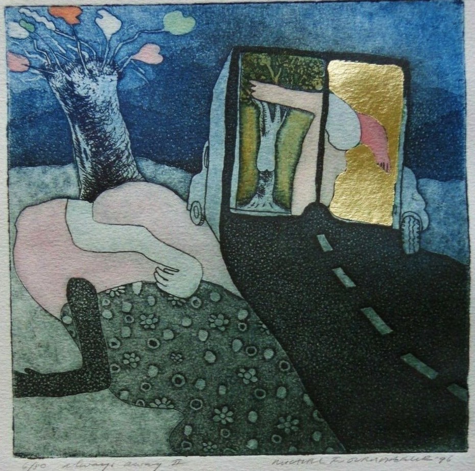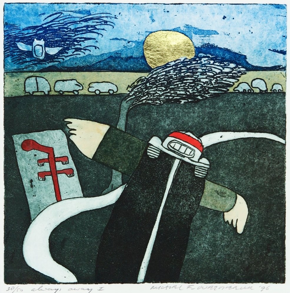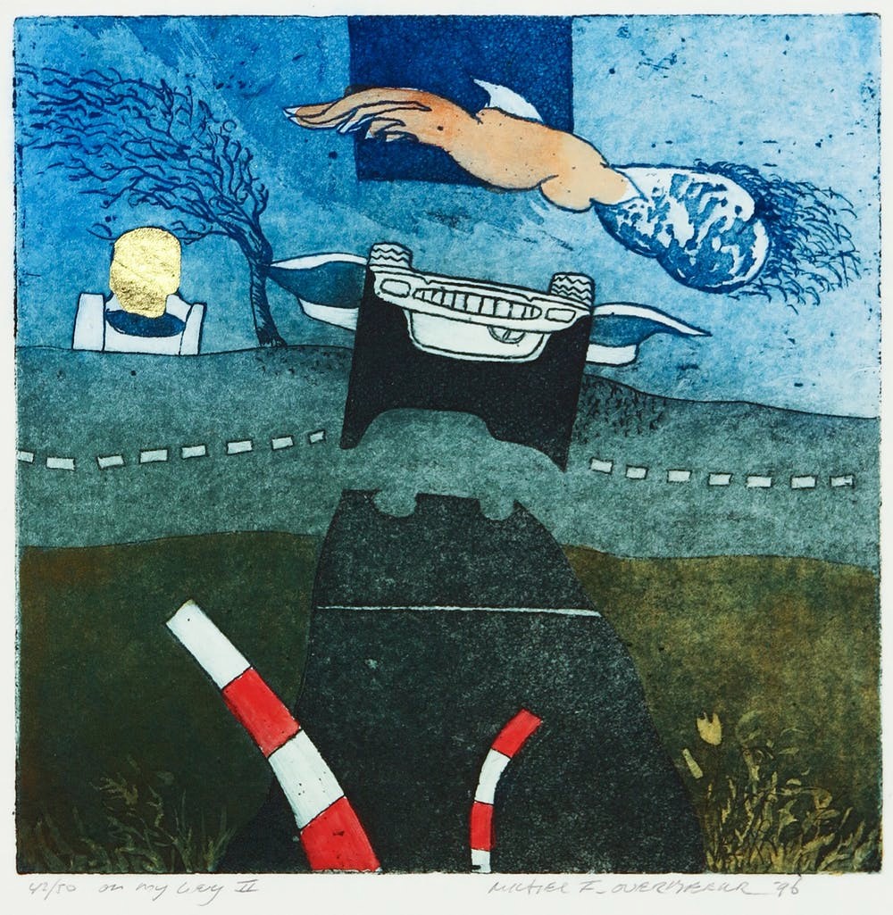 In 1996 maakte Michel van Overbeeke drie series van drie etsen voor de Hiltermann Groep: ‘always away I+II+III / on my way I+II+III / aware-away I+II+III’ met als thema ‘de auto’. De Hiltermann Groep gaf deze etsen aan relaties die andere firma’s konden overhalen om hun auto bij de Hiltermann Groep te gaan leasen. Of het veel geholpen heeft, weet ik niet. Je ziet ze namelijk niet zo vaak… 1996 – on my way II – 1 vd 50 – 19 x 19 cm – foto kunstveiling.nl