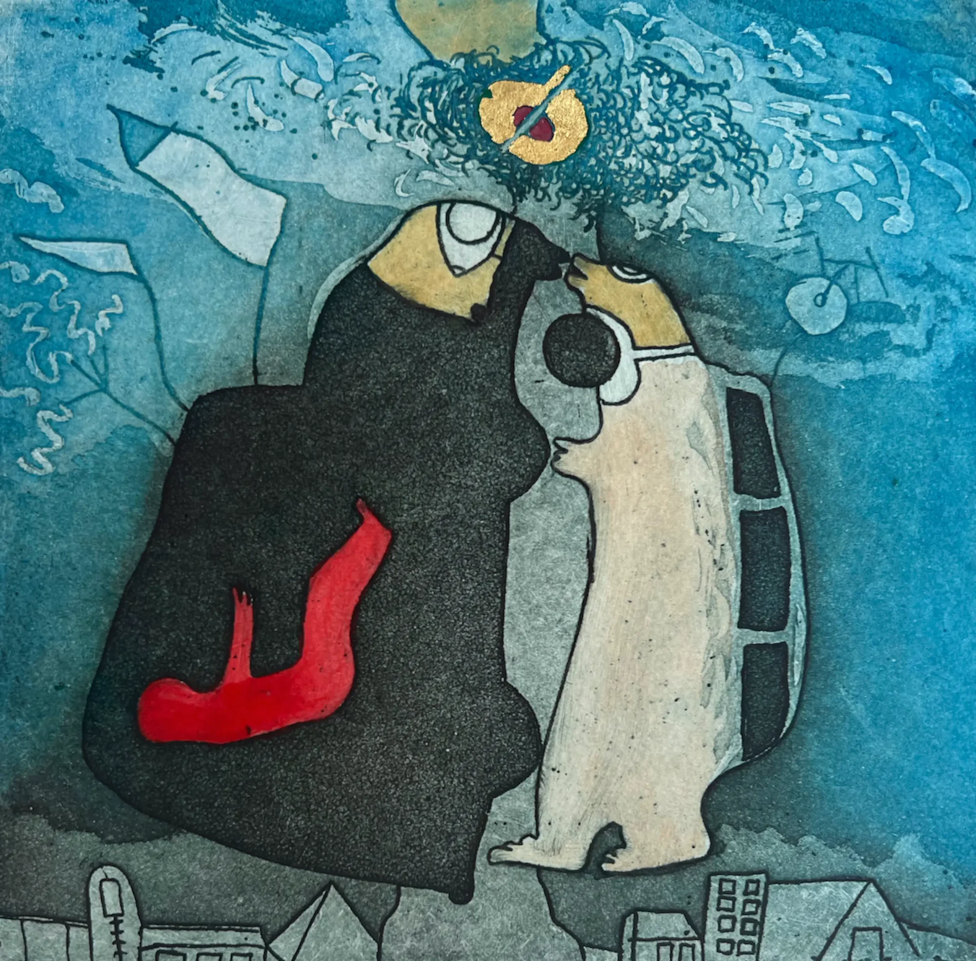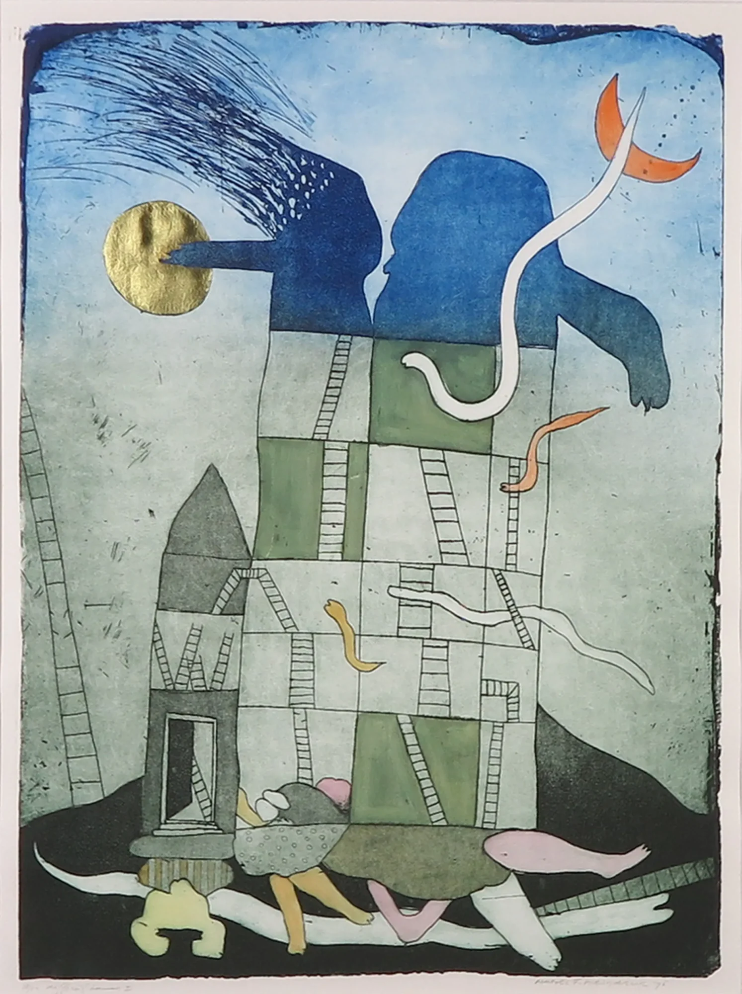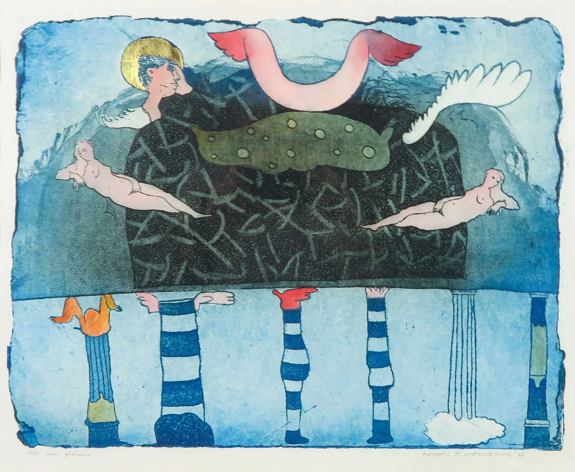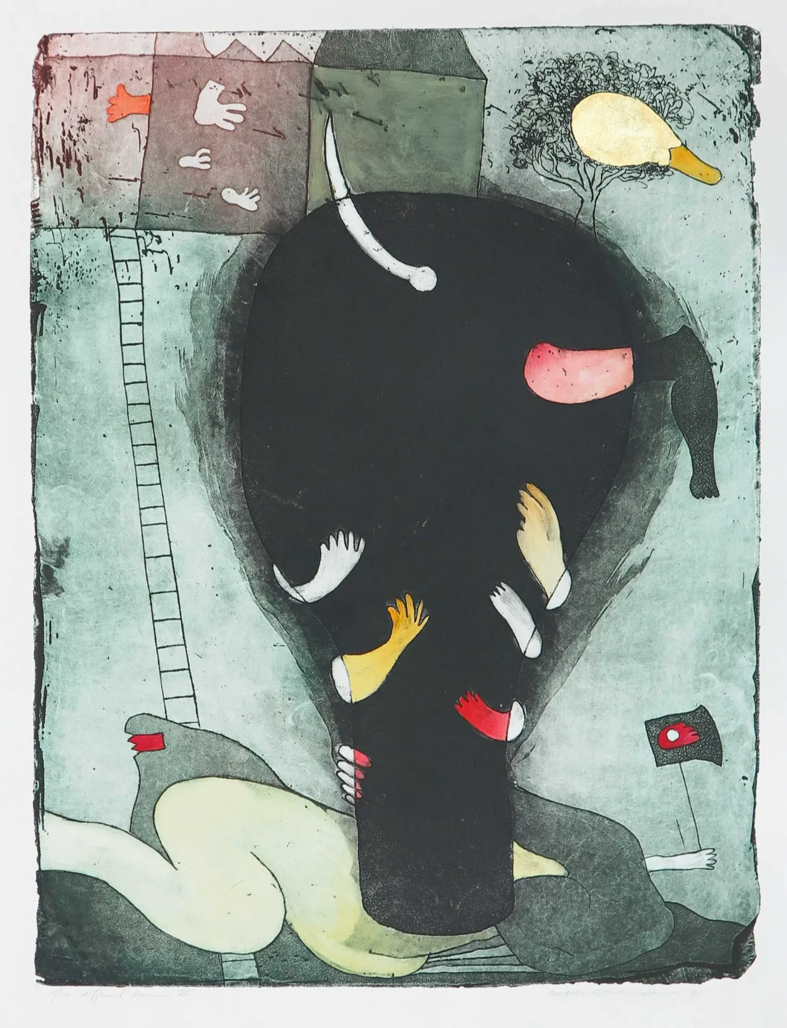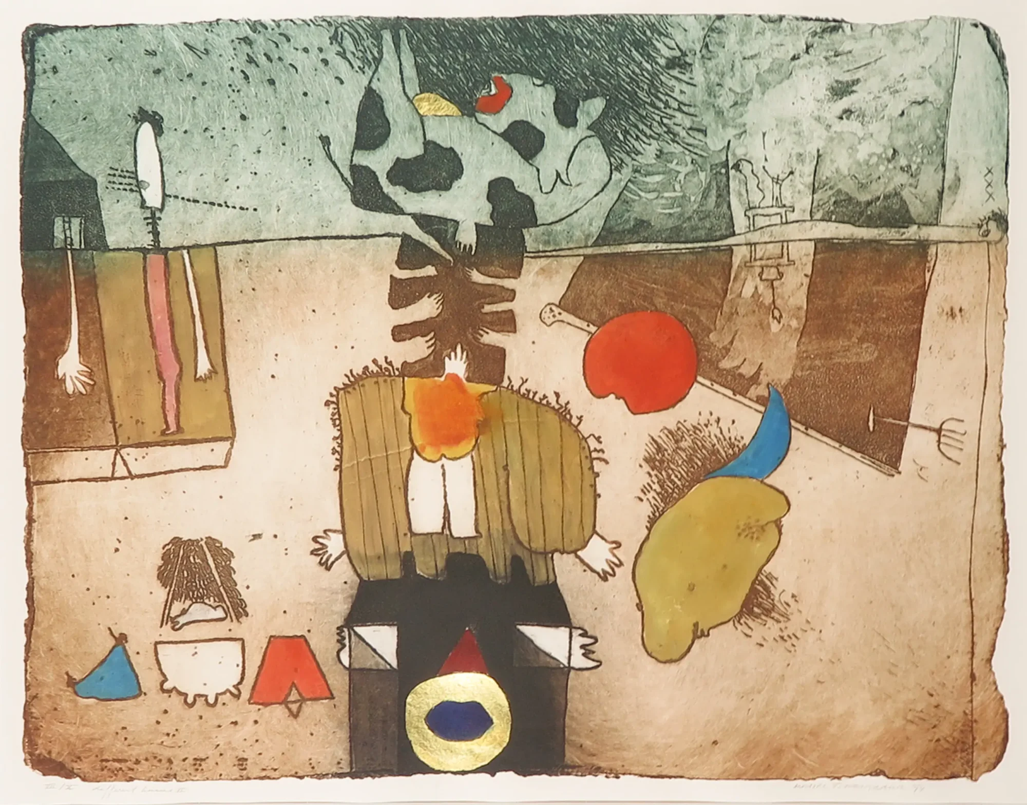 In 1996 maakte Michel van Overbeeke drie series van drie etsen voor de Hiltermann Groep: ‘always away I+II+III / on my way I+II+III / aware-away I+II+III’ met als thema ‘de auto’. De Hiltermann Groep gaf deze etsen aan relaties die andere firma’s konden overhalen om hun auto bij de Hiltermann Groep te gaan leasen. Of het veel geholpen heeft, weet ik niet. Je ziet ze namelijk niet zo vaak… 1996 – on my way II – 1 vd 50 – 19 x 19 cm – foto kunstveiling.nl