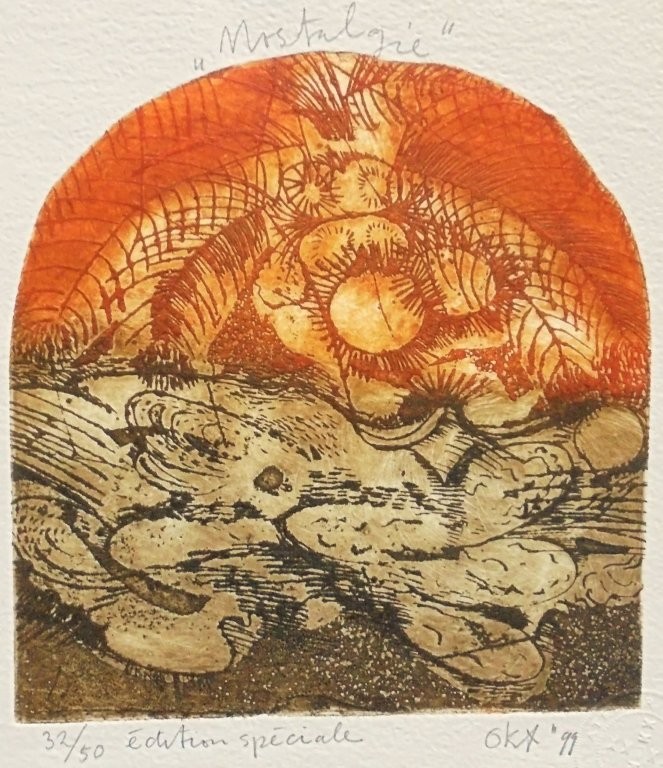 Hoewel schilderen de hoofdarbeid van Kees Okx was, heeft hij ook een goede naam gemaakt met zijn prachtige etsen. Mij is onbekend hoeveel etsen hij in totaal heeft gemaakt en heeft afgedrukt. Het zullen er velen zijn. Kees vertelde mij dat hij in de jaren 60 nog veel aan het experimenteren was.