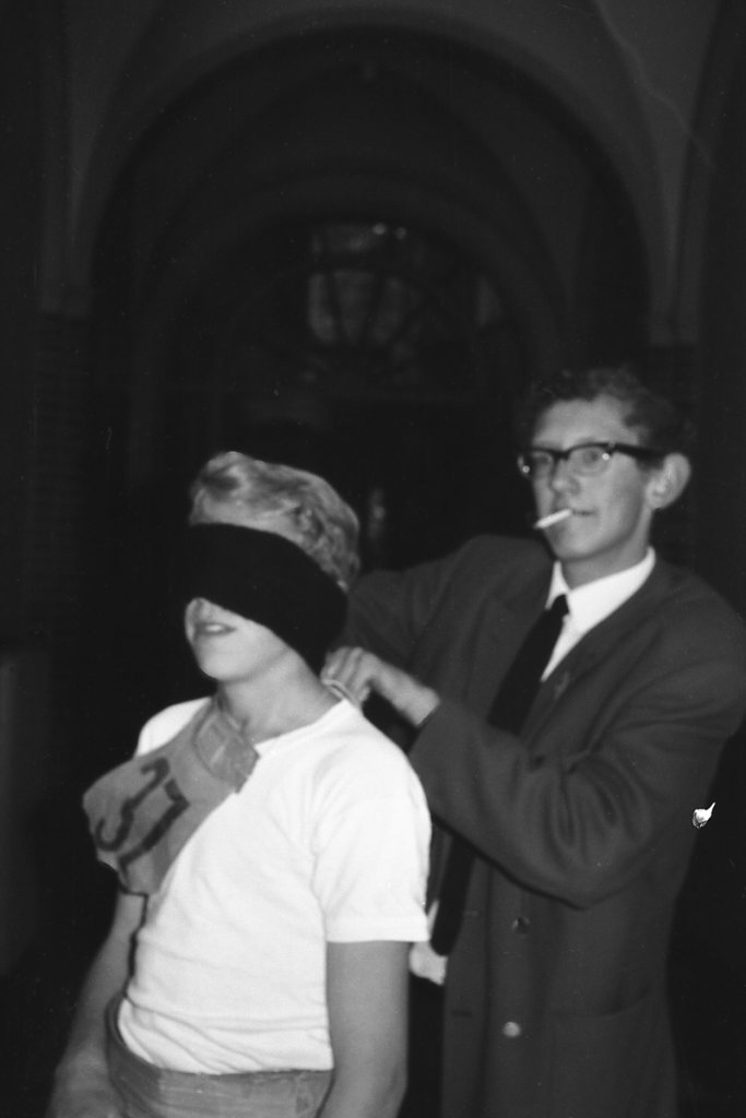 Oktober 1965 – Ontgroening van de derde klas – iedere feut werd geblinddoekt en in een donkere aula geduwd. De ouderejaars heeft niets met het artikel van doen!